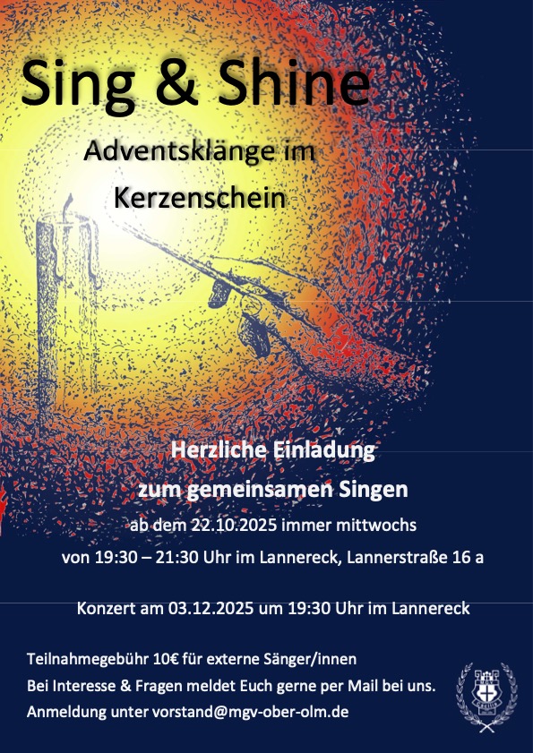 … dann sind Sie in diesem Jahr genau richtig bei uns im MGV Cäcilia. Ab dem 22. Oktober starten unsere Chöre mit der Probenarbeit für das Projekt „Sing & Shine“ – Adventsklänge im Kerzenschein.